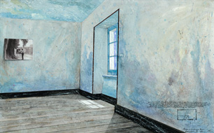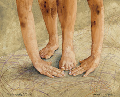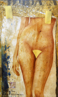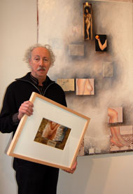 Dominique Ampe (België 1944) volgde zijn opleiding aan het Hoger Instituut voor Beeldende Kunsten Sint Lucas in Brussel en aan de Academie voor Schone Kunsten in Mechelen. Hij woont sinds de jaren negentig in Nederland en is als docent verbonden aan de Academie St. Joost in Breda. In zijn atelier valt de diversiteit en eenheid in zijn werk op. Zowel in zijn grote schilderijen in olieverf op linnen als in zijn werken in gemengde technieken op papier. In zijn olieverfschilderijen zijn vele verwijzingen te vinden naar zijn jeugd: sjablonen van behangpapier, ramen met blauwe lucht, ontbrekende portretten en delen van interieuren. Delen van de schilderijen zijn bijzonder verfijnt uitgewerkt en in andere delen wordt de realiteit losgelaten voor het pure schilderen. Een van de thema’s die Dominique onderzoekt is “de venus”. Al eerder was er in Galerie De Hollandsche Maagd werk van Dominique te zien tijdens thema-exposities zoals het schilderij “Een zeldzaam exemplaar” en het “L ‘Atelier Chanteuges en France”. In deze expositie is de vrouw in vele werken terug te vinden. In het schilderij: “Eva en de verleidelijke appel” verwijst hij naar de Eva van de gebroeders van Eyk uit het altaarstuk, Het Lam Gods. Daarnaast laat hij fragmenten van een vrouwenlichaam zien. De portretten van zijn modellen laat hij weg. Op een van de andere werken uit deze serie is op de muur een wit silhouet van een vrouw aanwezig. Voor wie langer kijkt komen er telkens nieuwe beelden en details naar voren. Voor deze serie ontving Dominique Ampe in 2008 de Prijs van de Stad Poperinge, België. In zijn tekeningen in gemengde technieken onderzoekt hij zijn onderwerp verder. Handen en voeten in een summier aangeduide ruimte. Beelden die vaak weer terug komen in andere werken. Ook is er een reeks kleinere werken waarin hij beelden van vrouwen combineert met kalligrafische structuren van teksten en muziek. Hier vervagen soms de grenzen tussen tekenen en schrijven. Boeiende beelden met de sporen van gedachten en herinneringen zijn het resultaat.